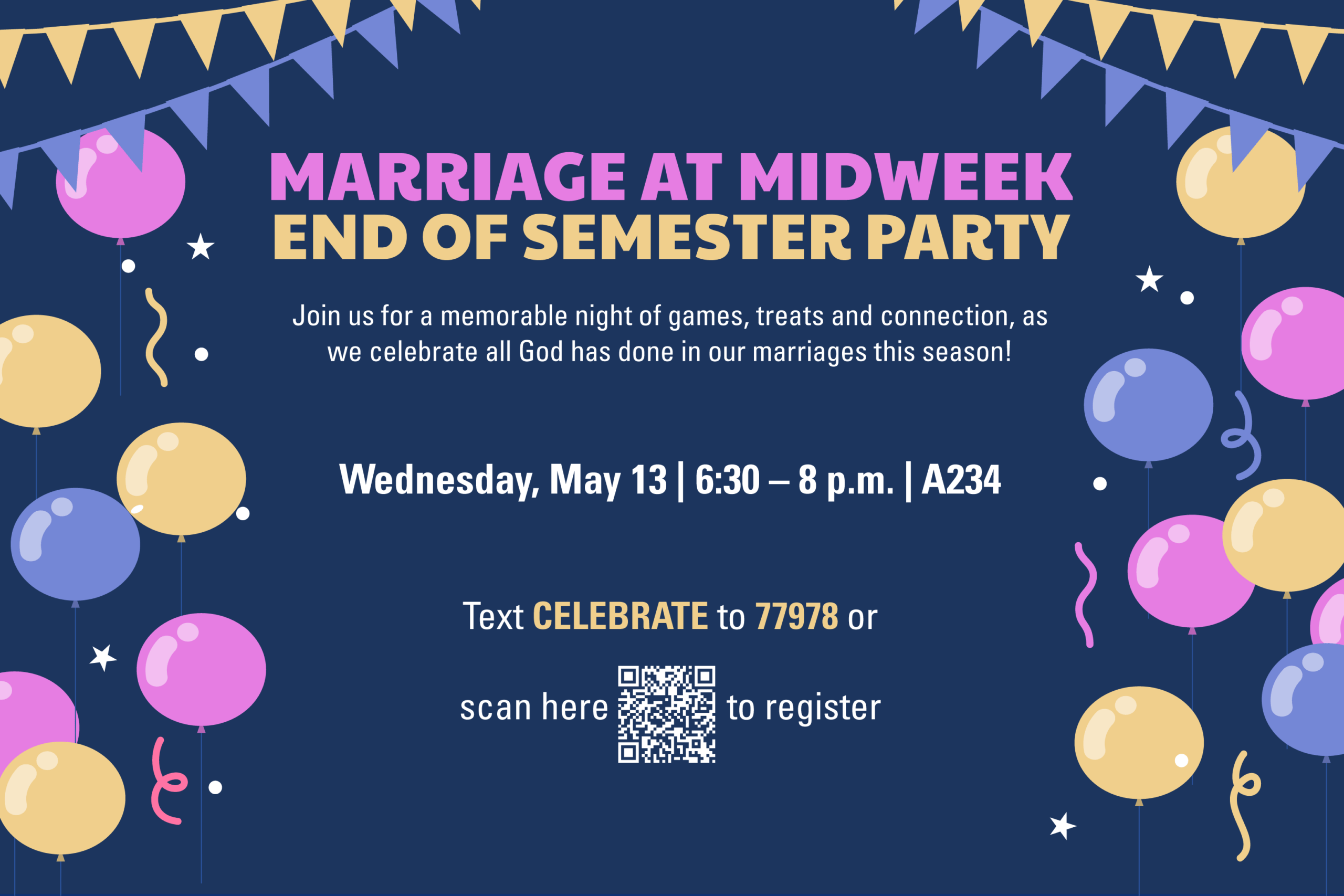 Let’s celebrate all God has done in our marriages this season! Join us for a memorable night of games, treats, and connection. Whether you’ve attended before or are just jumping in, we’d love to see you and your spouse as we wrap up with laughter and community.