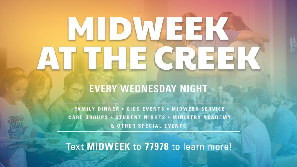 Midweek at the Creek is a time for anyone and everyone to gather at Cottonwood Creek for the opportunity to fellowship over a meal, worship, participate in fun activities, attend informative classes and grow deeper in their relationship with God.