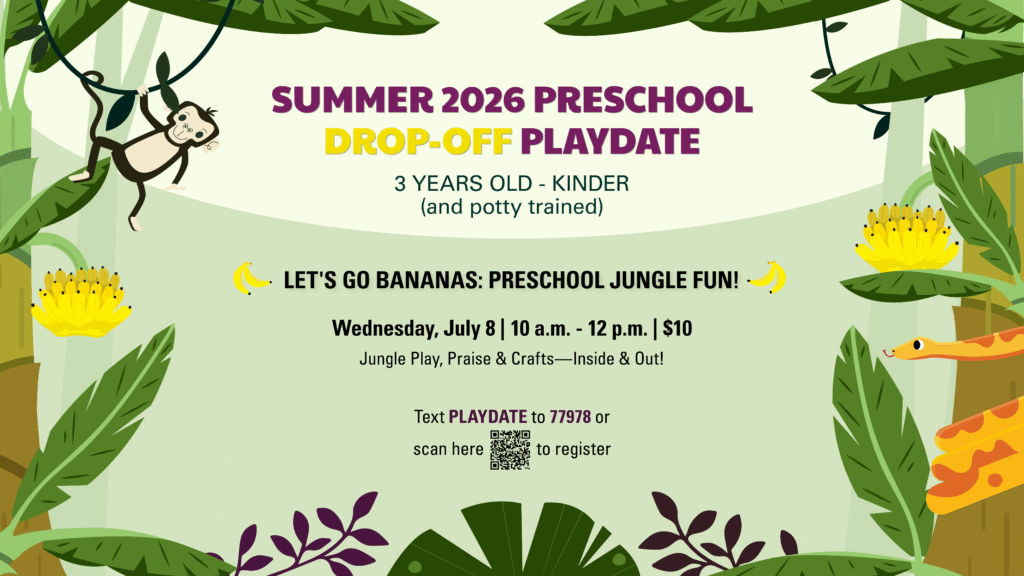 Swing on over for a roaring good time at our Preschool Jungle Adventure! We’ll create crafty creatures, play joyful jungle games, and worship our great Creator who made the whole wild world! Indoor & Outdoor Rotations — come ready for a morning of movement, music, and monkeying around!